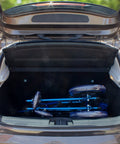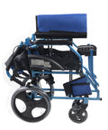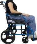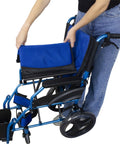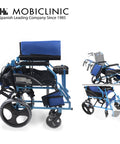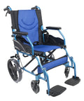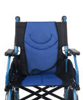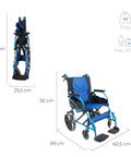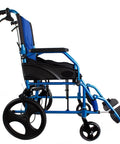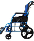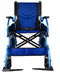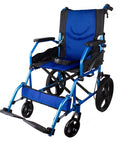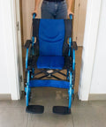 Silla de ruedas plegable de aluminio con frenos en los manillas, color azul